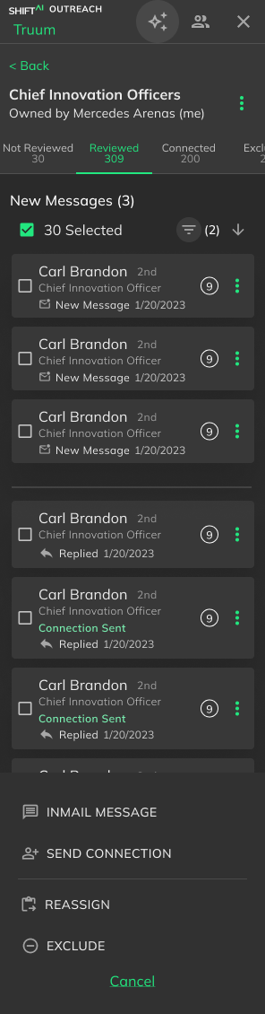Quick Actions and Filters: To make managing leads more efficient, I included quick actions and filters for lead lists. Users could take bulk actions—such as messaging leads—based on the lead’s status (e.g., connected, not connected, or not messaged).