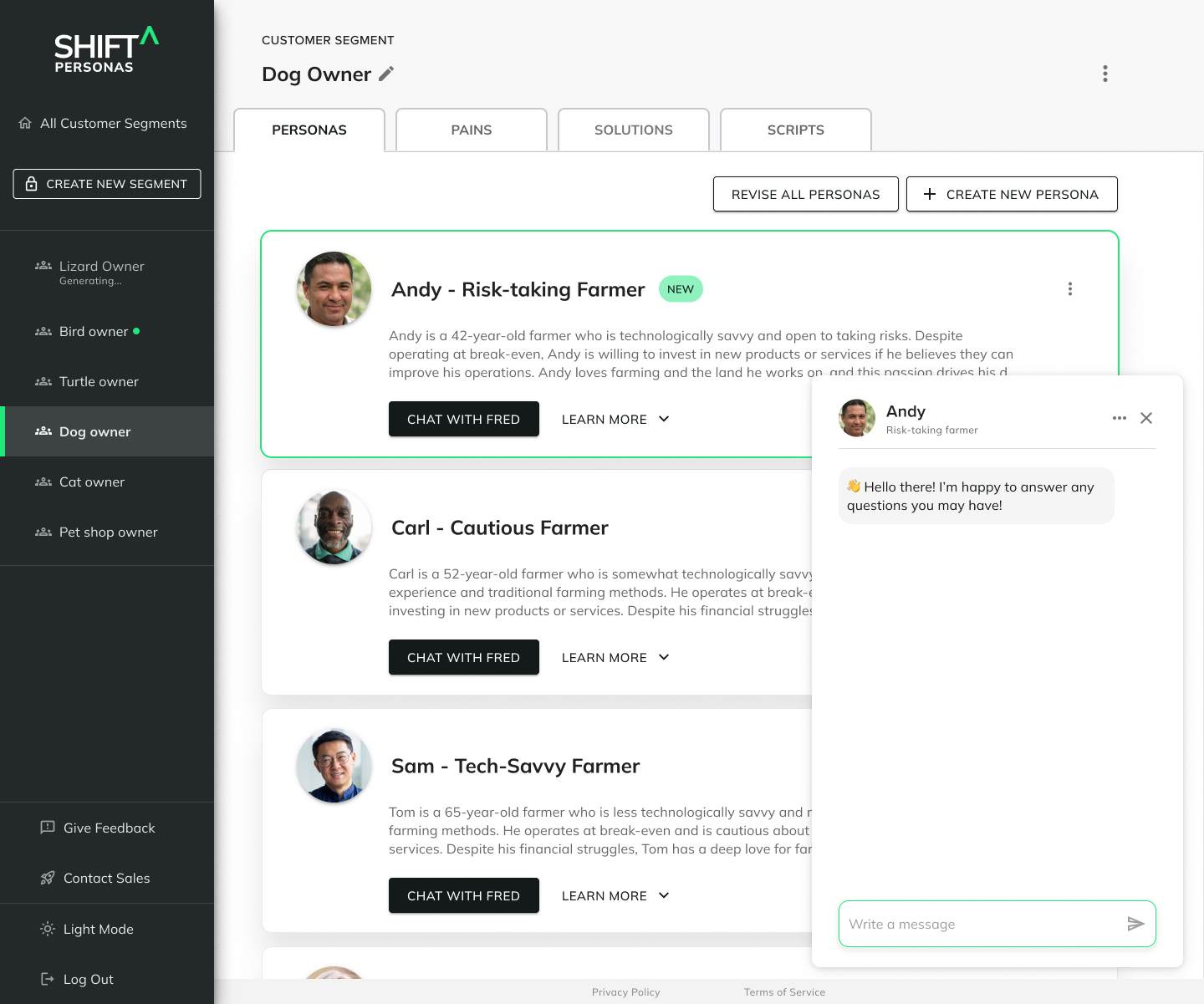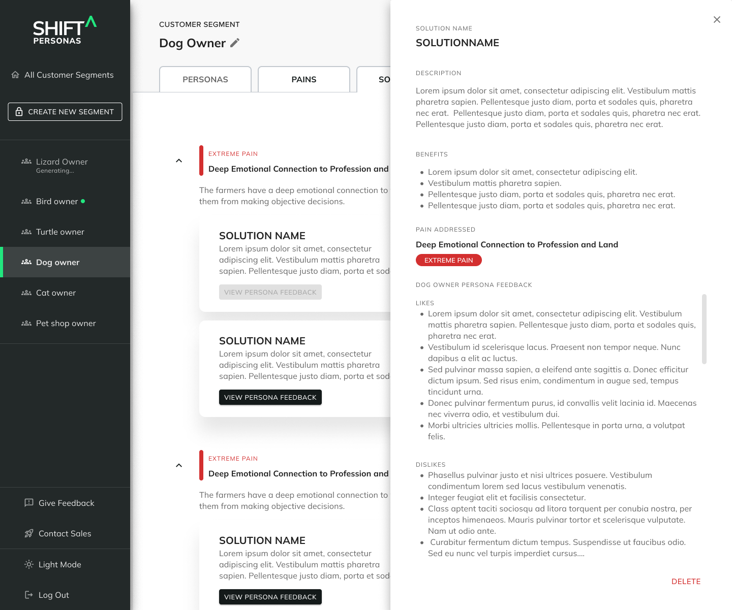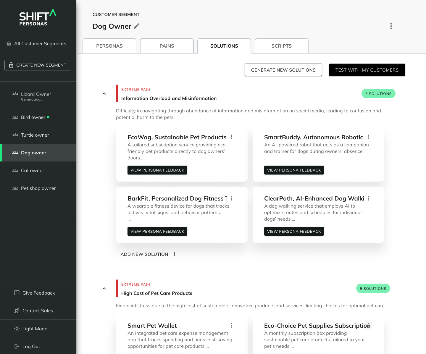 Pain Report: For each persona segment, we provide an AI generated pain point report to help identify major pain points and their severity.