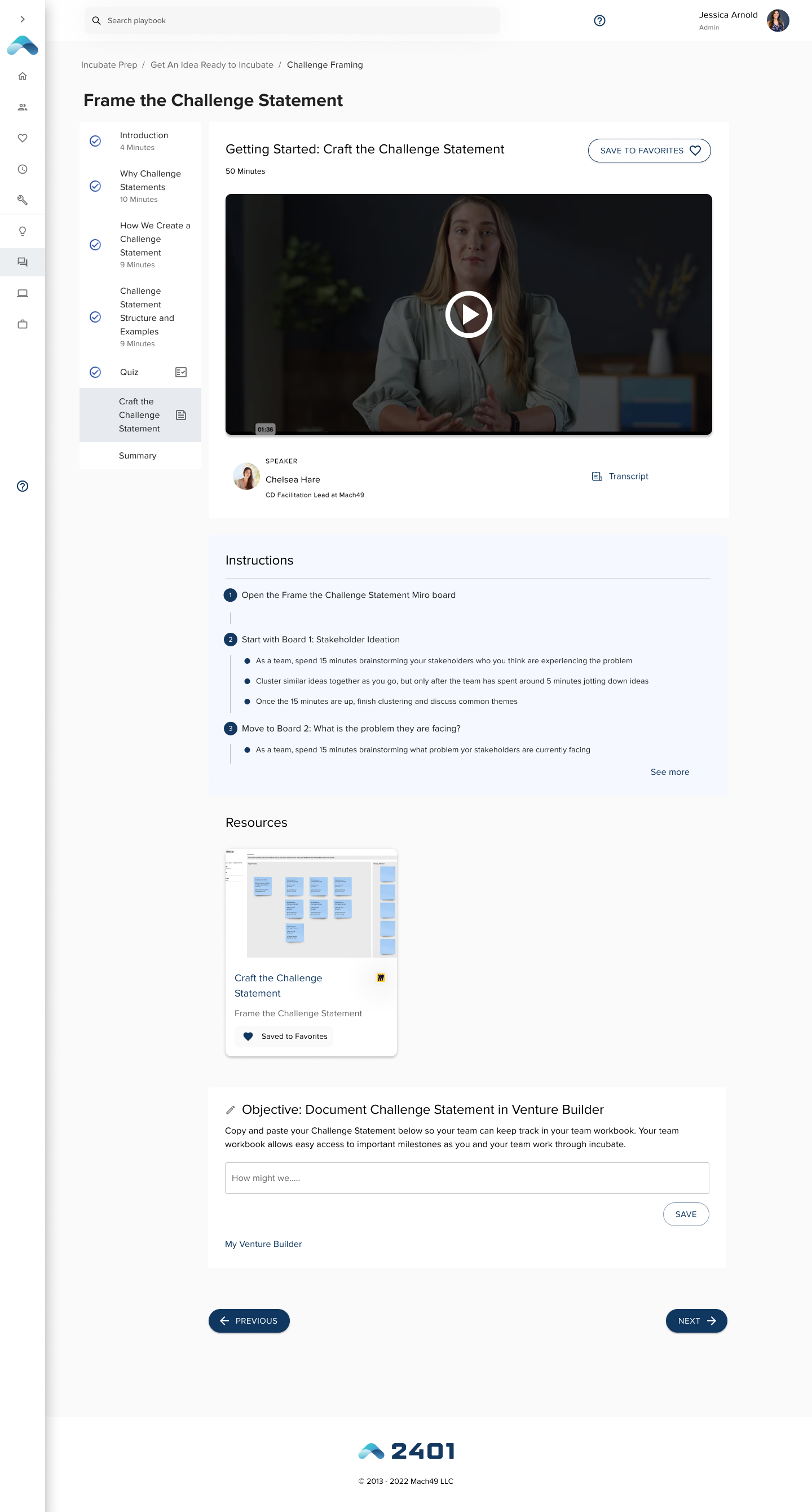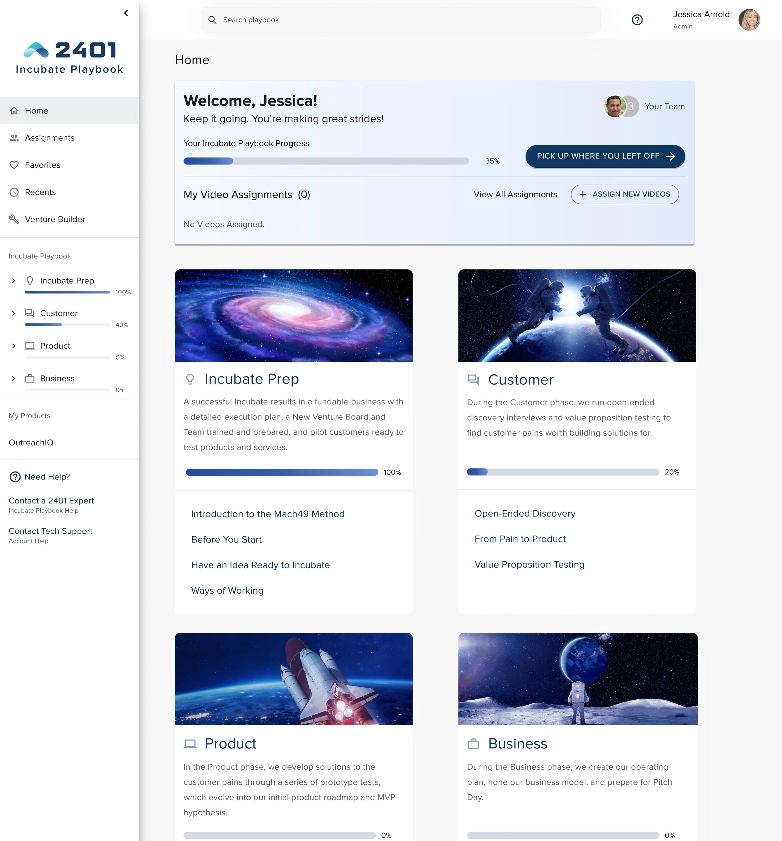 This digital learning platform complements our traditional in-person training, providing a robust, accessible, mobile friendly resource that supports the entire venture building process. The Incubate Playbook ensures that teams have continuous access to critical knowledge and tools, enhancing their ability to innovate and execute throughout the stages of venture development.