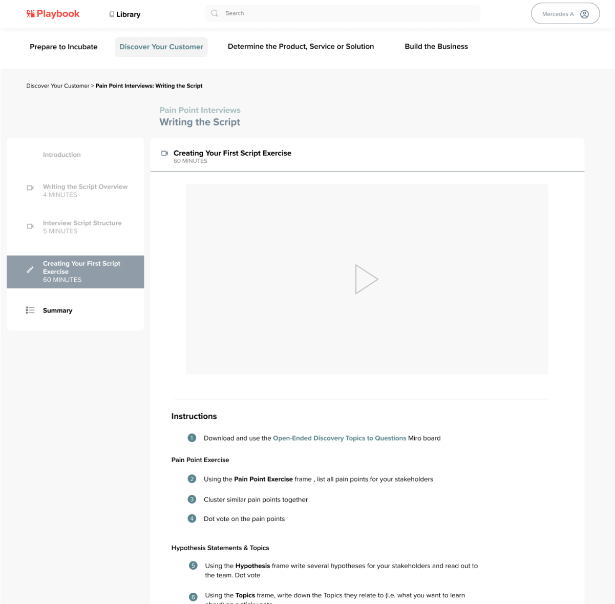 The learning material included method lessons and activities. In the activities users could watch a short clip of one of our experts walking through the activity, along with a step by step of the activity below. We linked up each team’s Miro boards before so they can easily access them directly from the playbook.